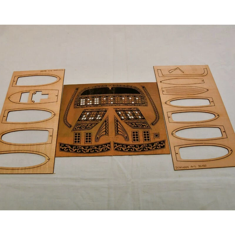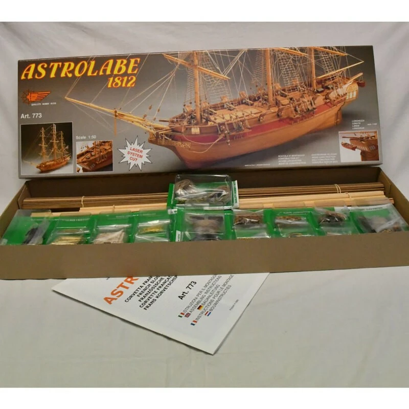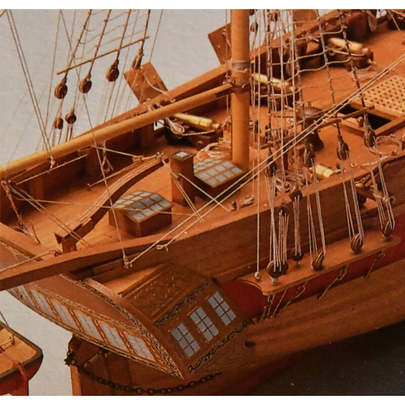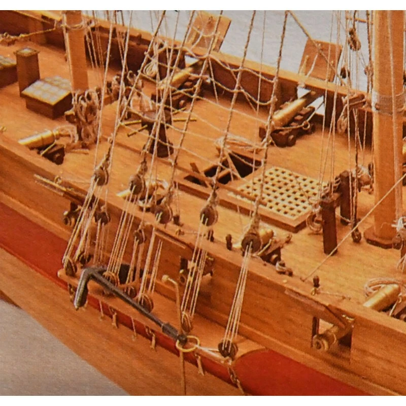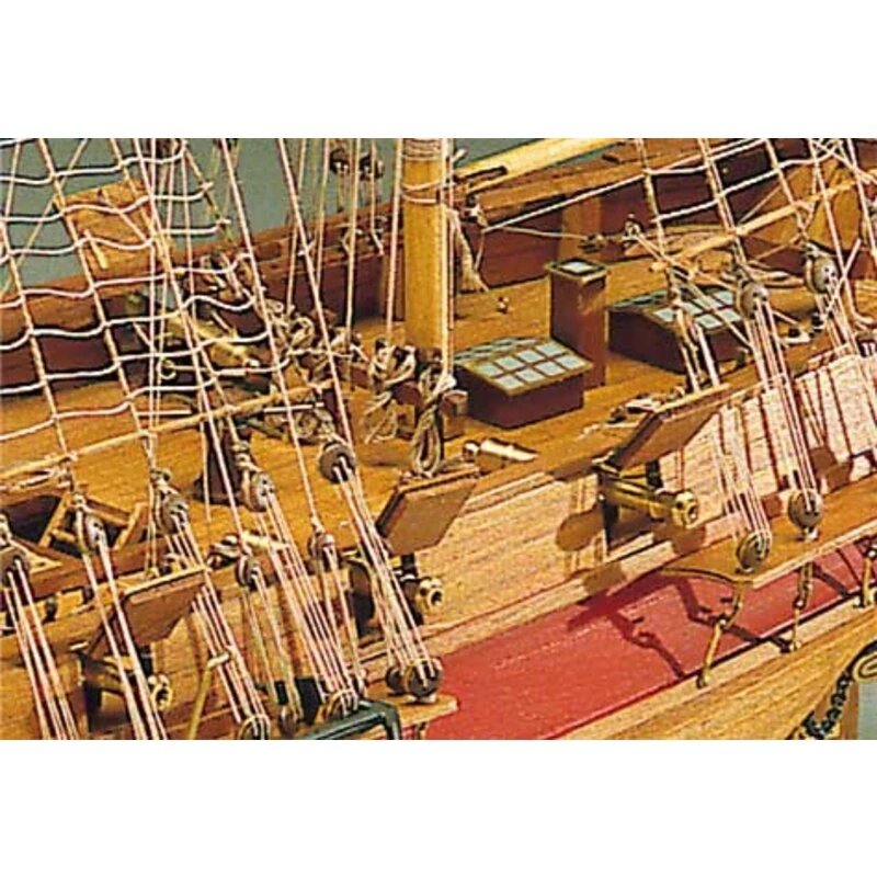 Accastillage très complet inclus dans la boîte, comprenant les poulies et caps de mouton en buis, les canons en laiton tourné, les pièces de décoration en laiton, la barque de sauvetage.