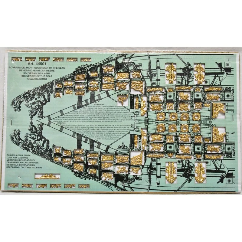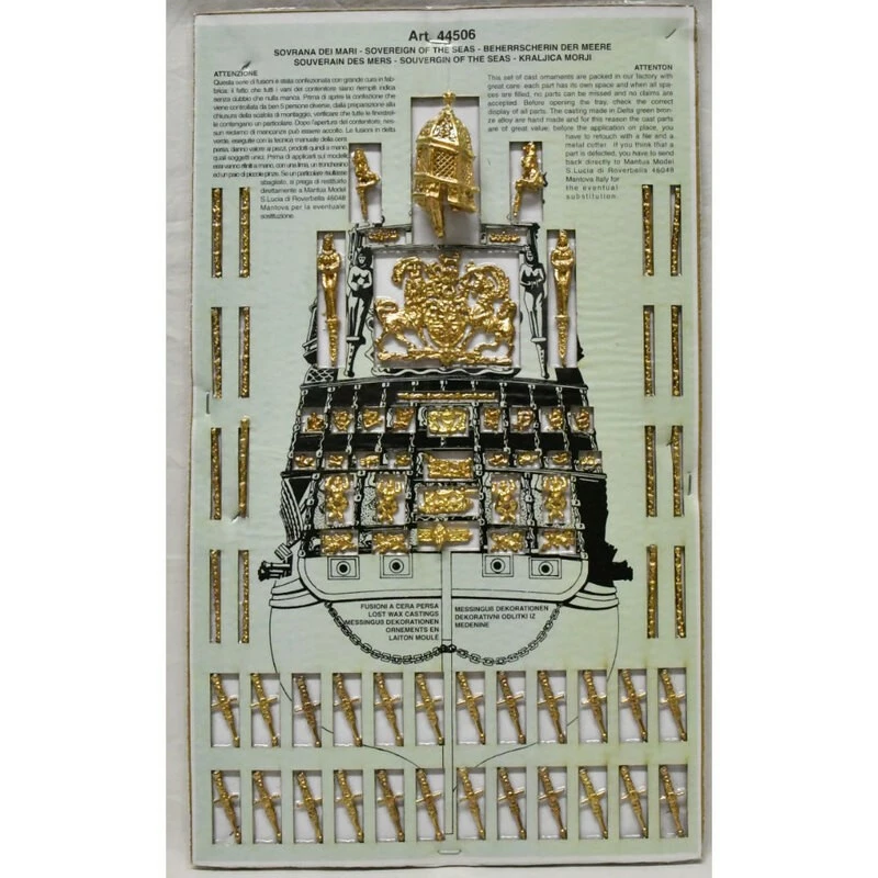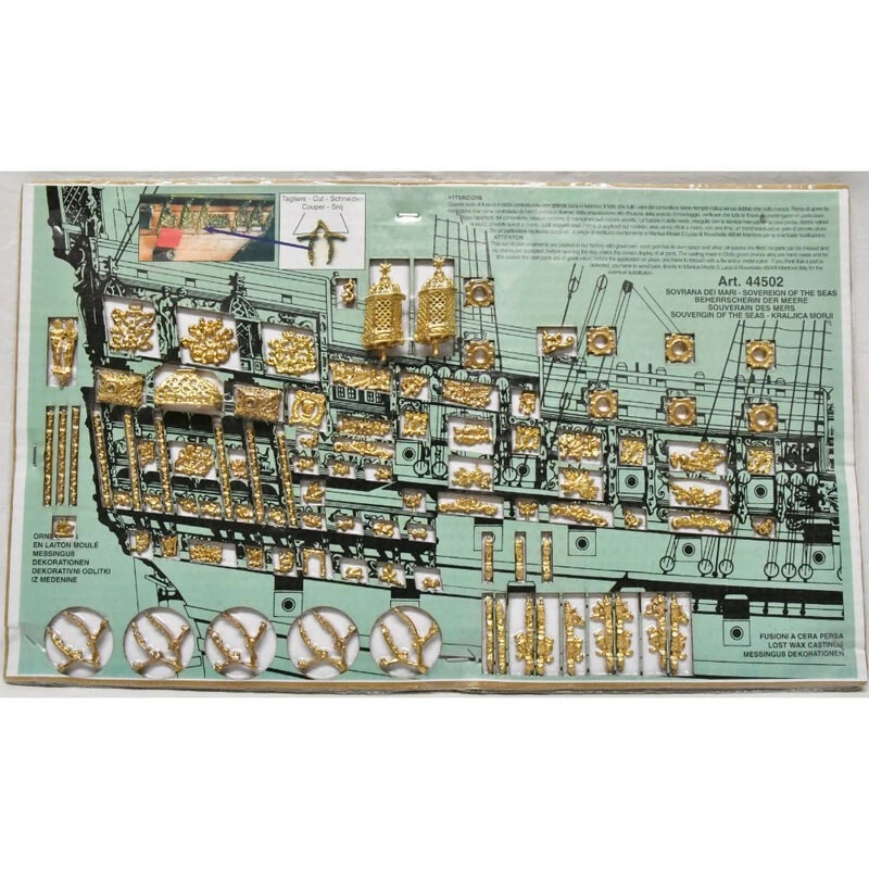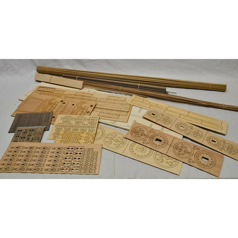 Sa très belle superstructure comporte plus de 700 pièces d’accastillage moulées en bronze et 102 canons moulés, caps de mouton et poulies en bois, drapeaux en soie imprimée.