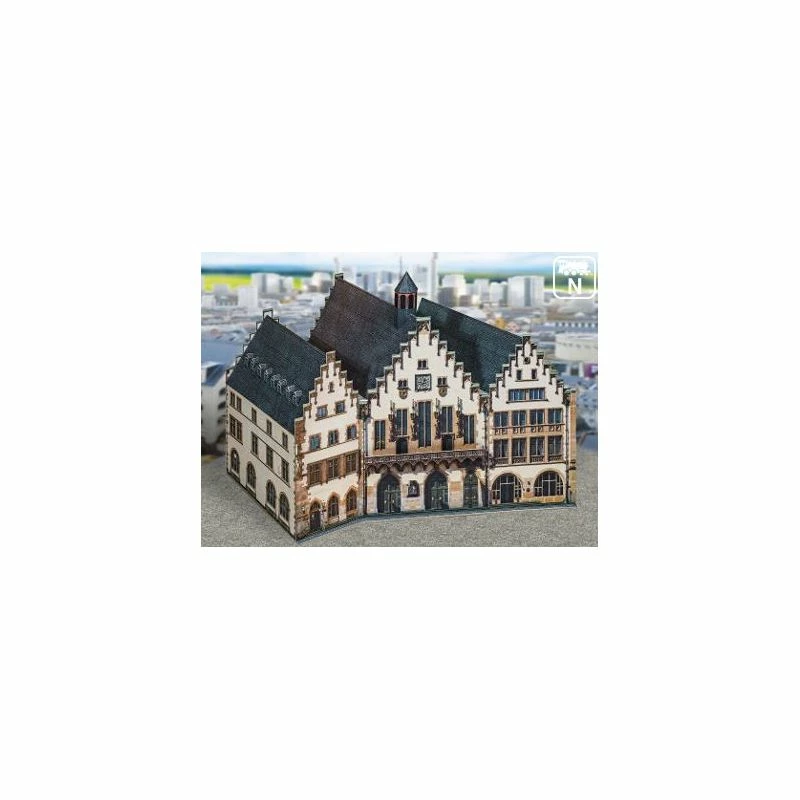 Sur le « Römerberg » (colline romaine) dans le centre-ville de Francfort-sur-le-Main se dresse un point de repère important de la ville, son hôtel de ville. Ce bâtiment est connu sous le nom de « Frankfurt Römer ». L’origine du nom n’est pas certaine, mais une théorie le fait remonter aux marchands italiens du Moyen Âge. Aujourd’hui, l’ensemble du complexe de l’hôtel de ville comprend onze bâtiments. Dans le modèle actuel, les trois bâtiments les plus anciens sont représentés avec leur façade historique à trois pignons en escalier.
