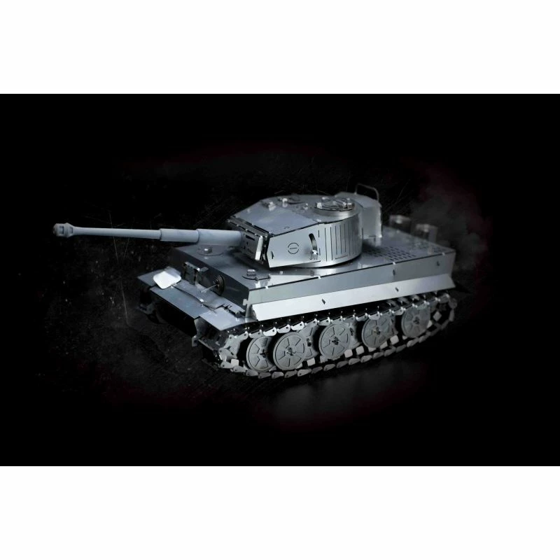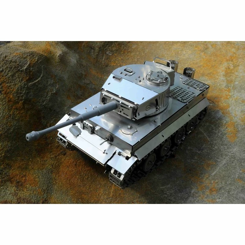 Une machine incroyablement puissante. Ce réservoir est facilement reconnaissable au motif « en damier » des rouleaux disposés en quatre rangées avec huit rouleaux de chaque côté. Tout comme un vrai char, notre modèle dispose d’un mécanisme de réglage de la tension des chenilles à l’aide de boulons à visser. La roue motrice du char est placée à l’avant, et c’est ainsi dans notre modèle. Modèle radiocommandé à monter soi-même.