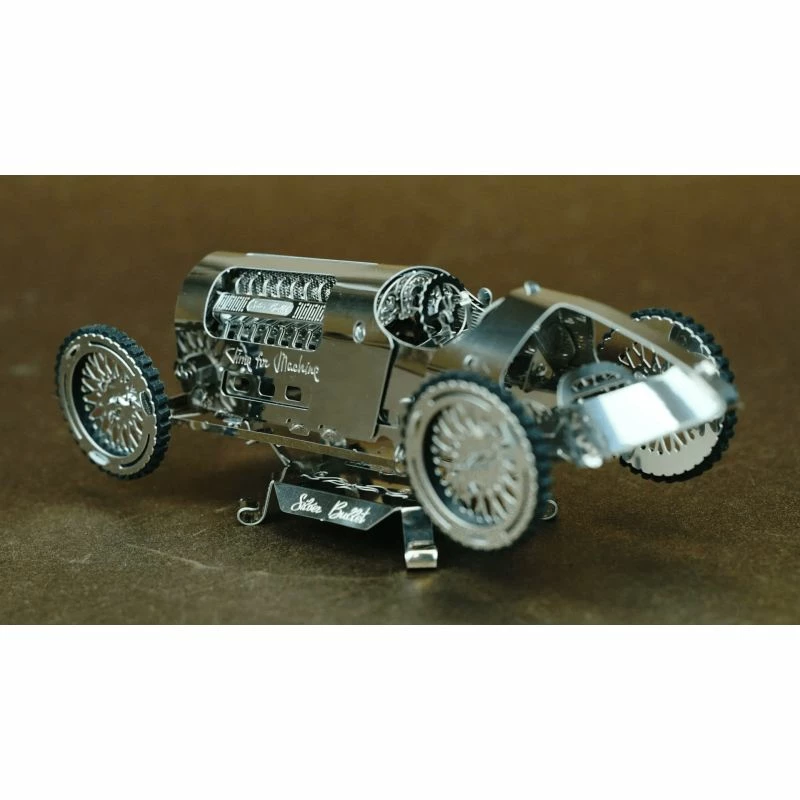 La voiture peut flotter au-dessus de la table grâce à un joli petit stand en métal. Le stand est également décoré de la gravure Silver Bullet, le nom du modèle