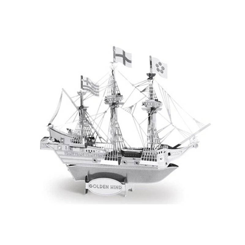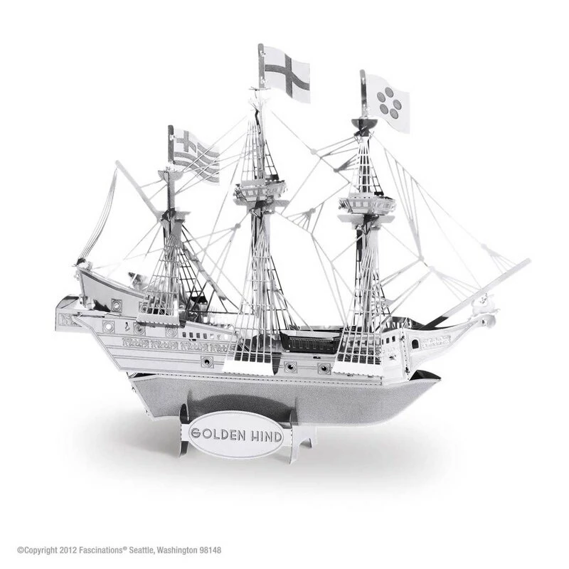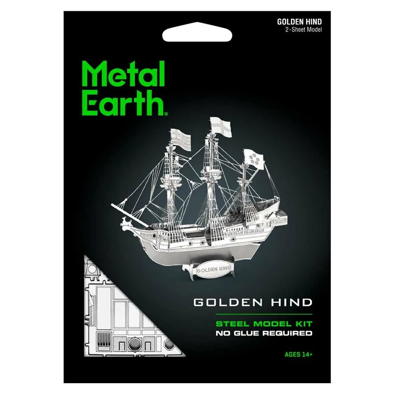 MetalEarth Bateaux: GOLDEN HIND 11×3.5x9cm, maquette 3D en métal avec 2 feuilles, sur carte 12x17cm, 14+