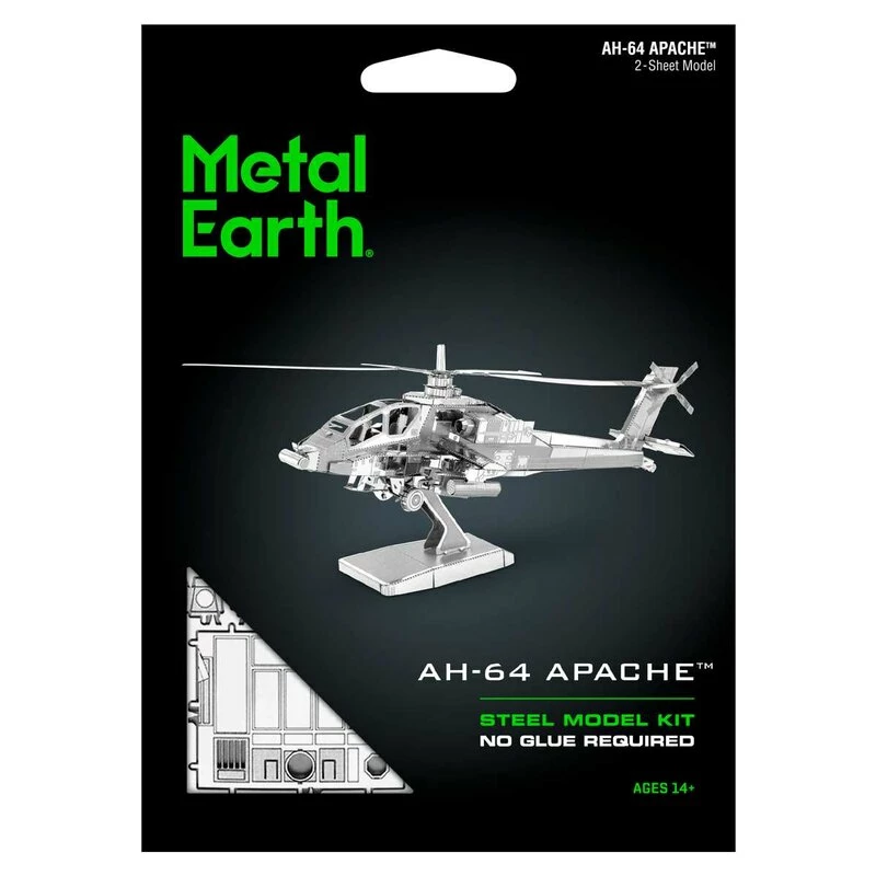 MetalEarth Aviation: AH-64 APACHE 12.2×12.2×5.5cm, maquette 3D en métal avec 2 feuilles, sur carte 12x17cm, 14+