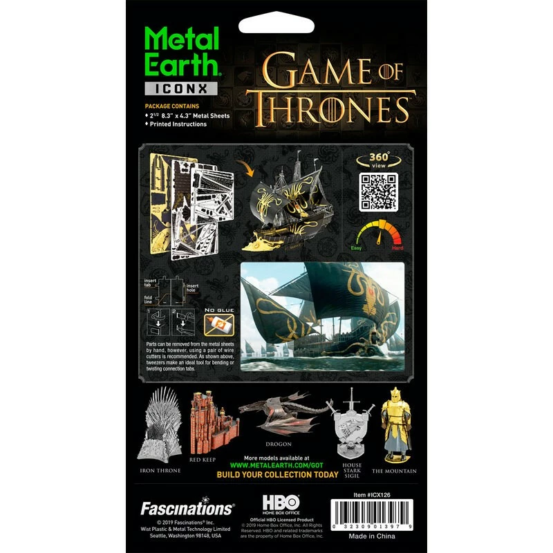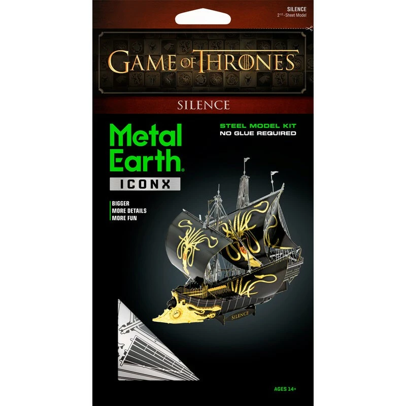 MetalEarth: ICONX – GAME OF THRONES / GREYJOY SHIP SILENCE 11.9x11x12.2cm, maquette 3D en métal avec 2.5 feuilles multicolorées, sur carte, 14+