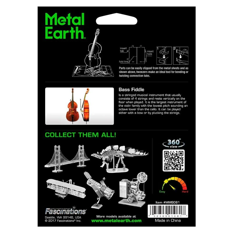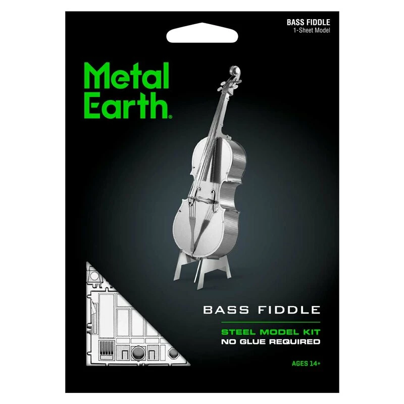 MetalEarth Musique: BASS DE VIOLON 3.7×2.2×11.7cm, maquette 3D en métal avec 1 feuille, sur carte 12x17cm, 14+