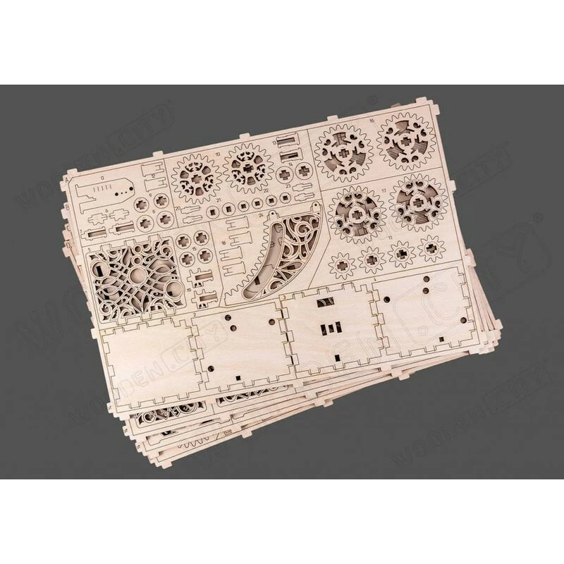 L’horloge magique Wooden City possède deux cadrans, un pour les heures et un pour les minutes. Elle est ornée de jolies gravures fantaisie et possède des engrenages en rotation qui soutiennent le rythme de la pendule. Cette horloge permet d’observer l’ensemble du mécanisme d’horlogerie le plus basique. Le mouvement de l’horloge dure une demi-heure.