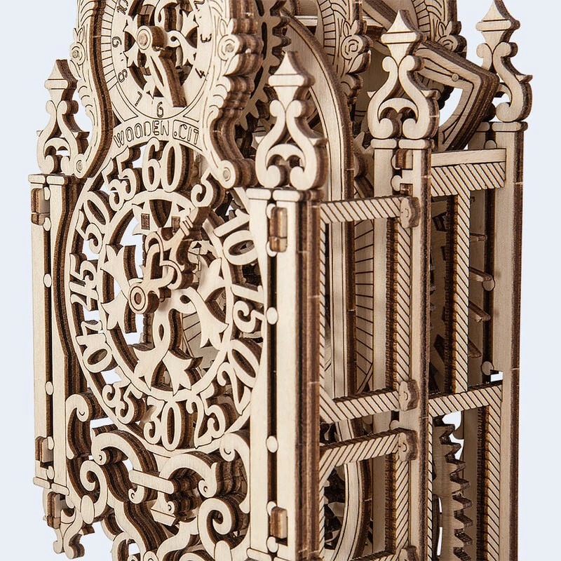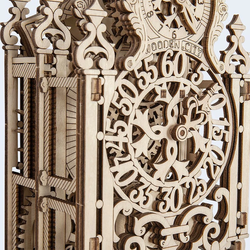 L’horloge magique Wooden City possède deux cadrans, un pour les heures et un pour les minutes. Elle est ornée de jolies gravures fantaisie et possède des engrenages en rotation qui soutiennent le rythme de la pendule. Cette horloge permet d’observer l’ensemble du mécanisme d’horlogerie le plus basique. Le mouvement de l’horloge dure une demi-heure.